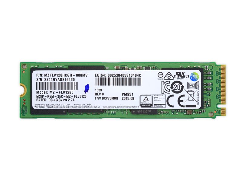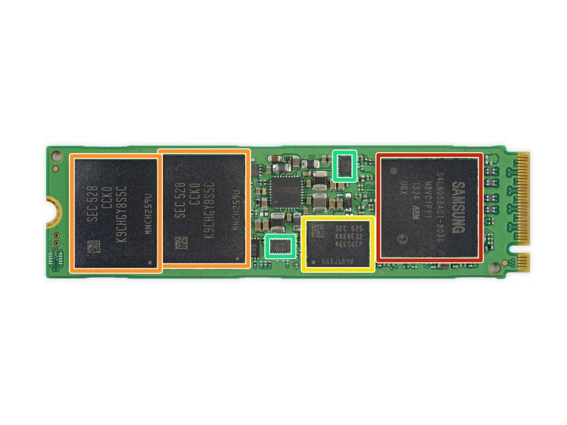 빨간색은 삼성 S4LN058A01 PCIe 3.0 x4 AHCI 플래시 컨트롤러(맥북 에어 13인치 2015년 모델에 들어감)