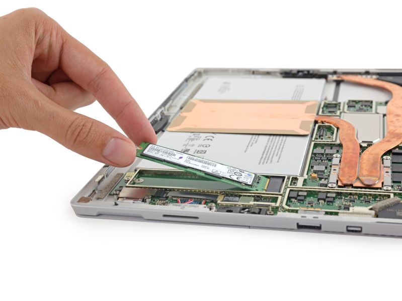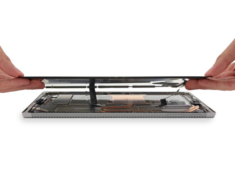 SSD 교체가 가능하고 배터리는 납땜돼 있지 않으나 강력한 접착제로 붙였습니다. 그리고 디스플레이가 표준 커넥터를 쓰지 않았고 접착제도 많이 써 분해가 어렵습니다. 전면 유리와 붙이기까지 했지요. 많은 부품들의 고정에 접착제를 쓰기도 했습니다.