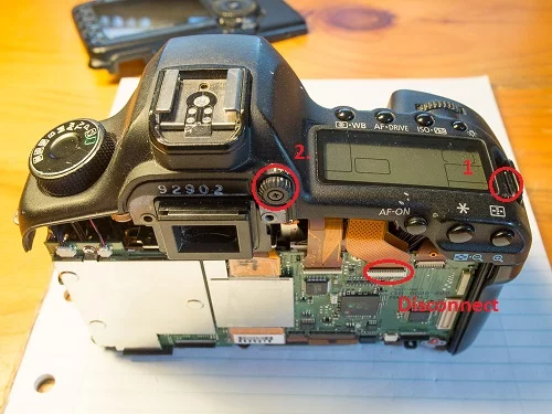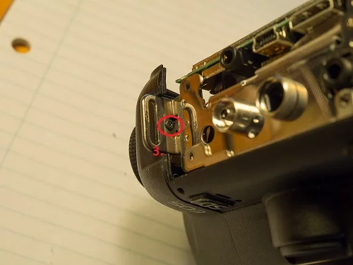 7. 상단 케이스 : 오른쪽 스트랩 마운트 옆에 하나의 나사와 왼쪽 스트랩 마운트의 아래쪽에 하나. 또한 뷰 파인더 디옵터를 제거하십시오. 메인 보드에 연결하는 리본 케이블이 하나 있습니다.이 탭에는 잠금 해제 용 팝업 탭이 있습니다.