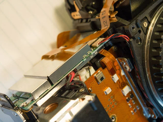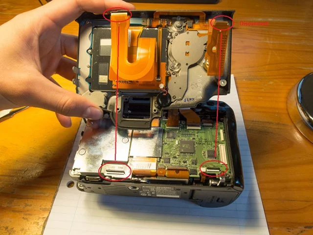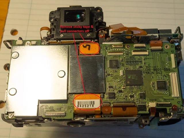 11. 밑면 보드 : 카메라 뒷면의 나사 3 개가 짧은 나사입니다. 커넥터에 가능한 한 가깝게 와이어를 위로 당겨서 커넥터 위에 손가락을 대고 연결 해제하여 쉽게 분리 할 수있는 커넥터 (2x2 핀, 1x3 핀 및 1x4 핀)를 찾았습니다. 다시 조립할 때 다시 소켓에 밀어 넣어 다시 연결하십시오. 또한 분리 할 5 개의 리본 케이블 연결이 있습니다. 가장 큰 커넥터는 커넥터에 검정색 플라스틱 탭이있어서 리본 케이블을 분리 할 때 뒤집어서 사용해야합니다.