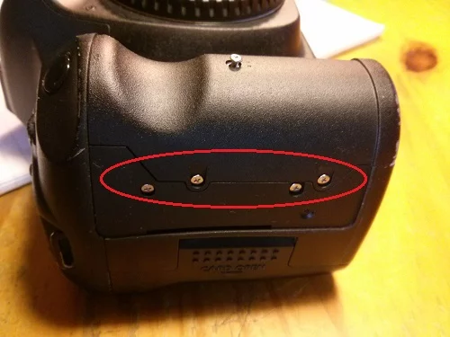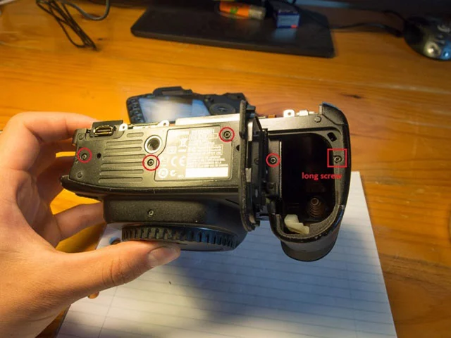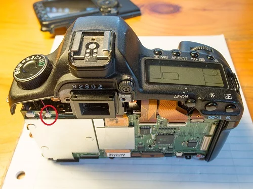 4. 후면 케이스 및 LCD 화면 : 모든 나사를 제거하십시오 : 접안 렌즈의 양쪽에 2 개의 긴 나사. 단일 은색 나사는 CF 슬롯 덮개의 왼쪽으로갑니다. 카메라 밑면의 나사 3 개는 바닥에있는 플러그 옆에있는 나사가 다른 두 개보다 짧음에 유의하십시오. 후면 덮개를 분리하기 전에 두 개의 리본 케이블을 분리해야합니다. 커넥터에는 리본 케이블을 분리 할 수있는 팝업 탭이 있습니다.